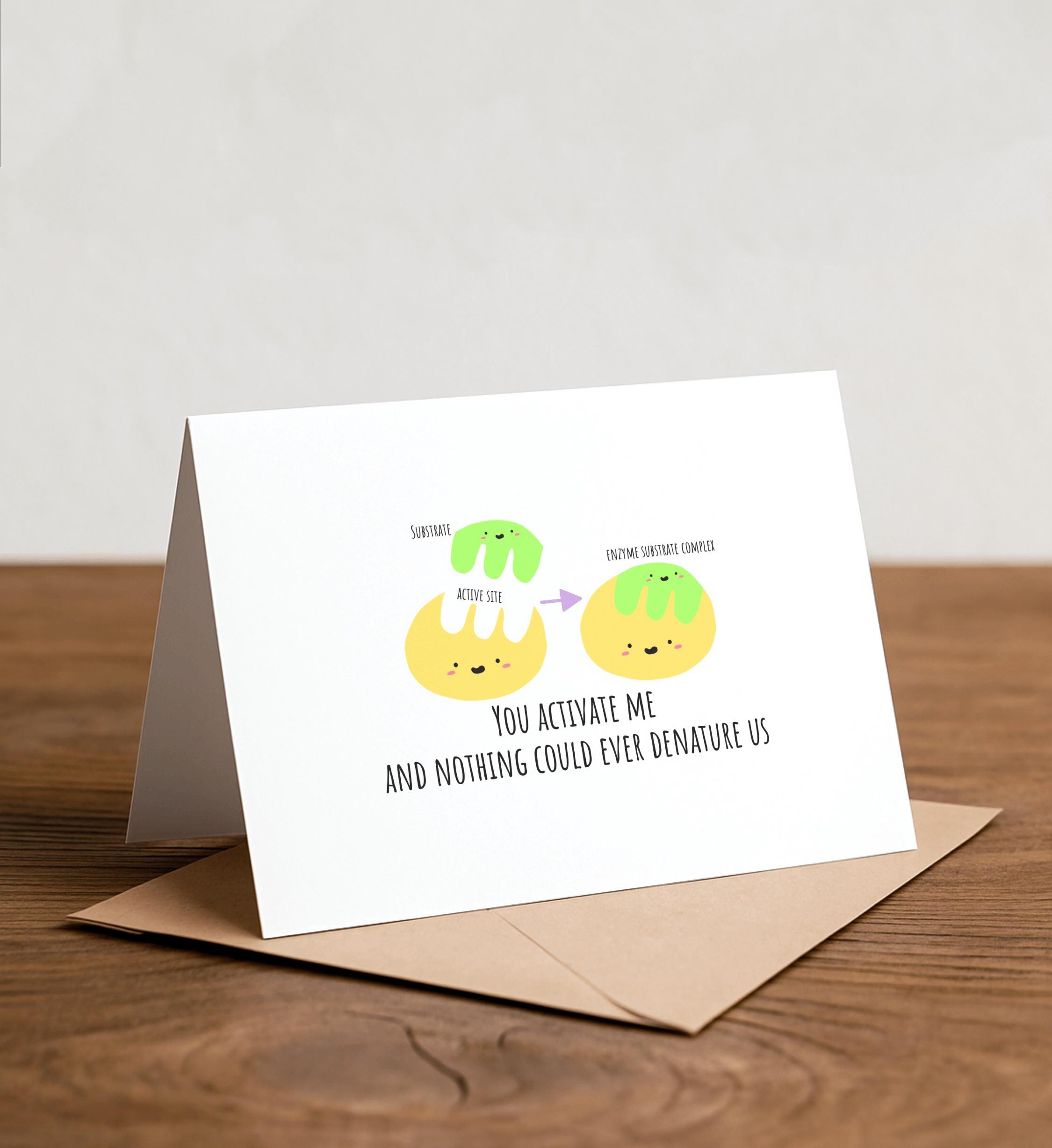 You activate me and nothing could ever denature us - Enzyme, Science pun, science card, biology card, active site, valentine, anniversary
