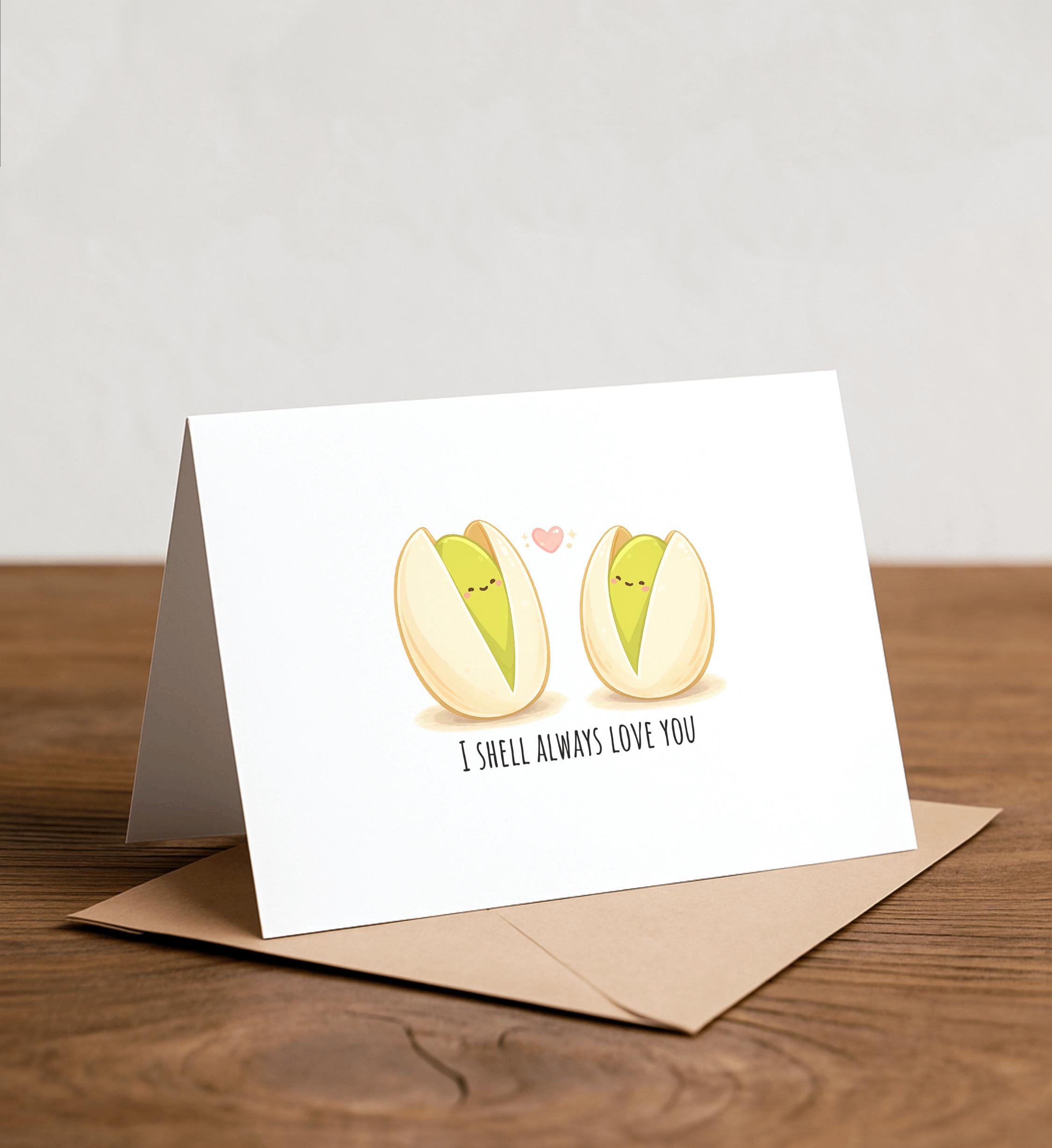 I SHELL always love you - Pistachio Greeting Card, postcard, valentine, Thank you, Pistachio, nuts, funny valentine, love pun, couples card