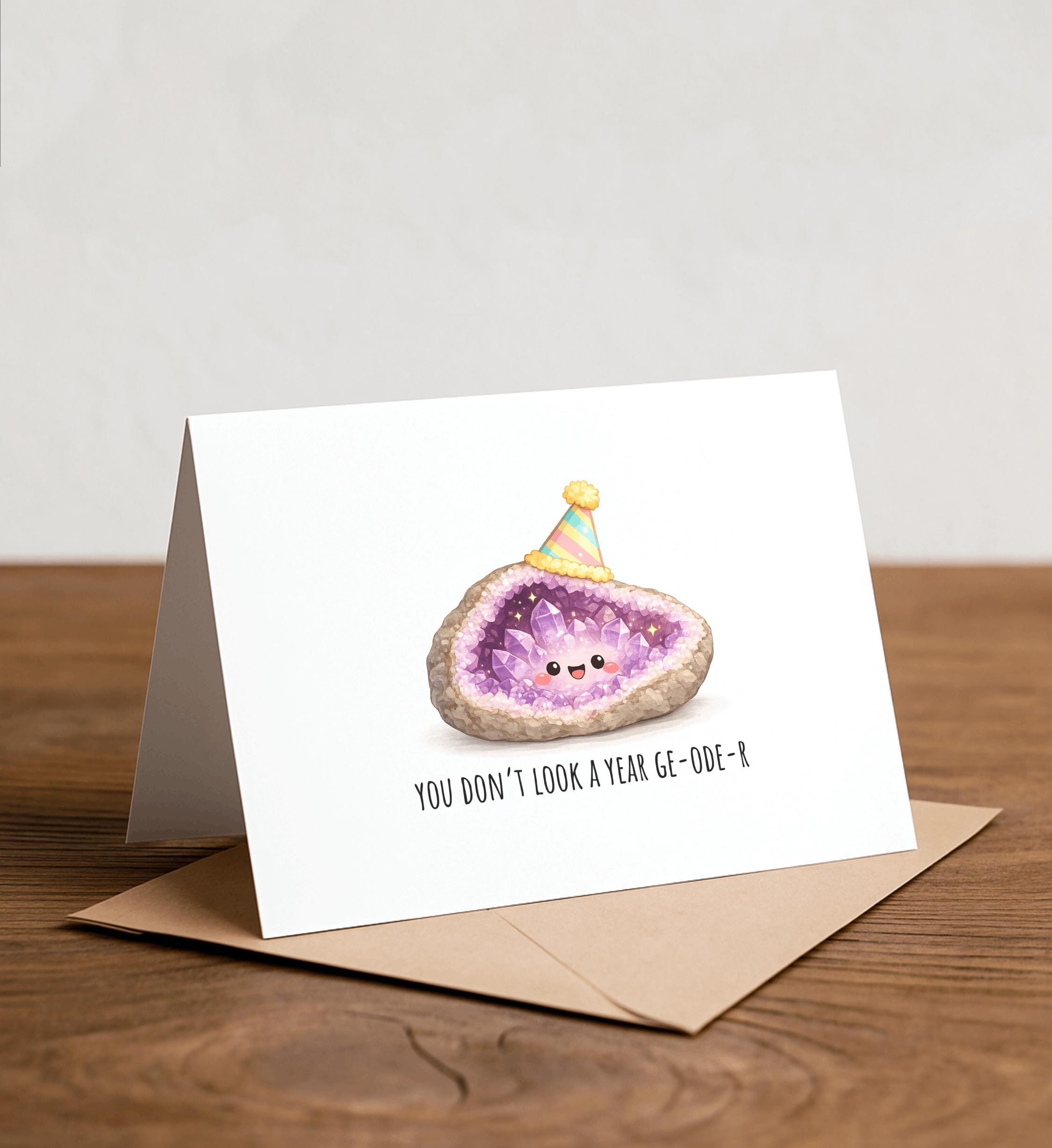 You don't look a year GE-OLD-ER - Funny Birthday Card, Cute Card, Handmade Card, Punny, Birthday Joke, Geode, Crystals, Amethyst, Geology