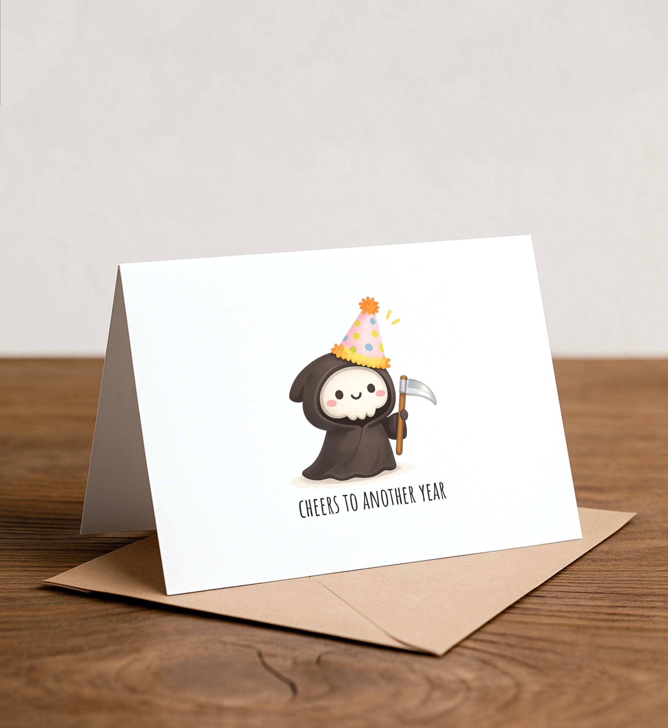 Cheers to another year! - Funny Birthday Greeting Card, Happy Birthday Card, Handmade Card, Grim Reaper, Morbid joke, dark joke