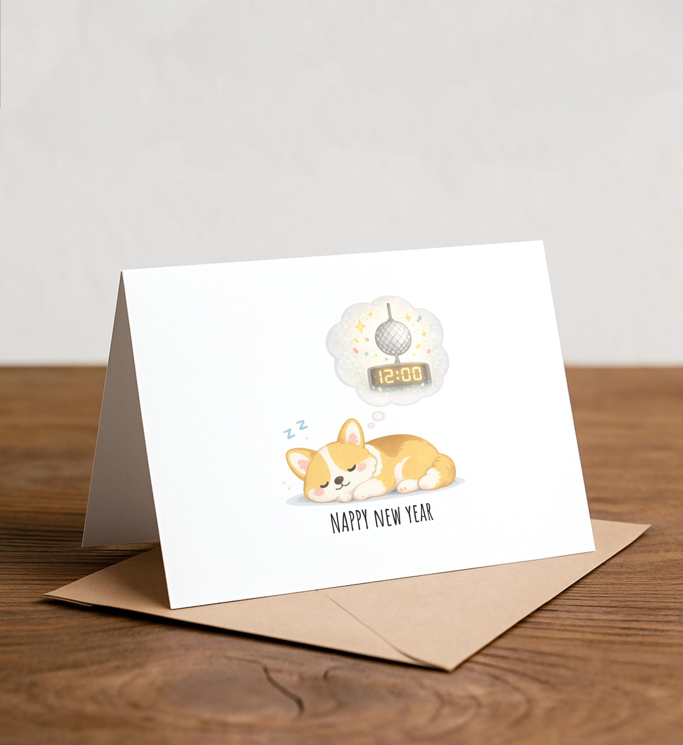Nappy New Year! - New Year's Card, New Years Ball Card, Corgi Card, Holiday Card, Adult New Years Card, Funny New Years, Happy New Year