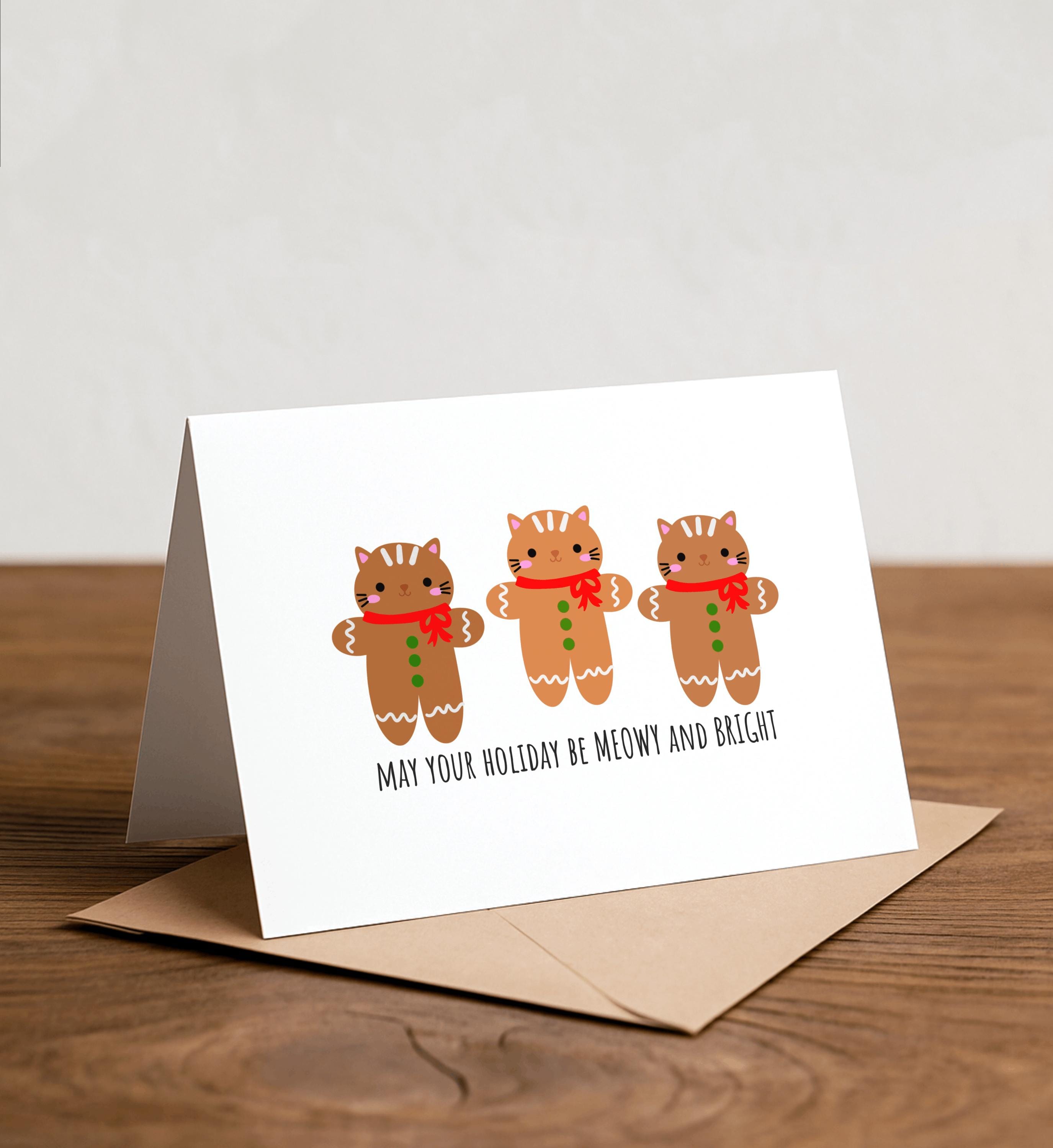 may your holiday be MEOWY and BRIGHT - Funny Christmas Card, Simple Holiday Card, Punny Christmas Card, Gingerbread, Cat