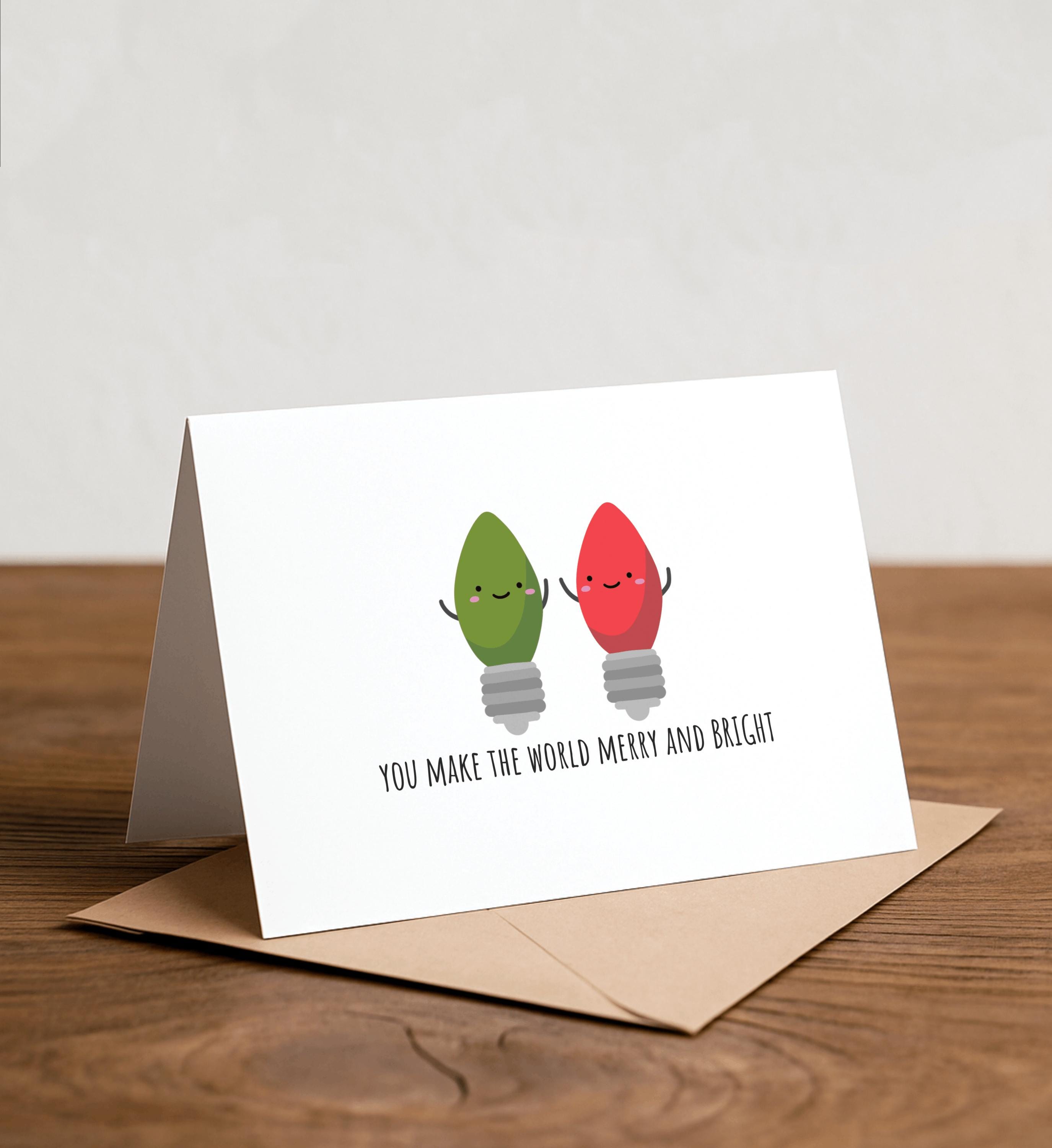 Funny Christmas Card - 'Merry and Bright' Pun, Handmade Holiday Card