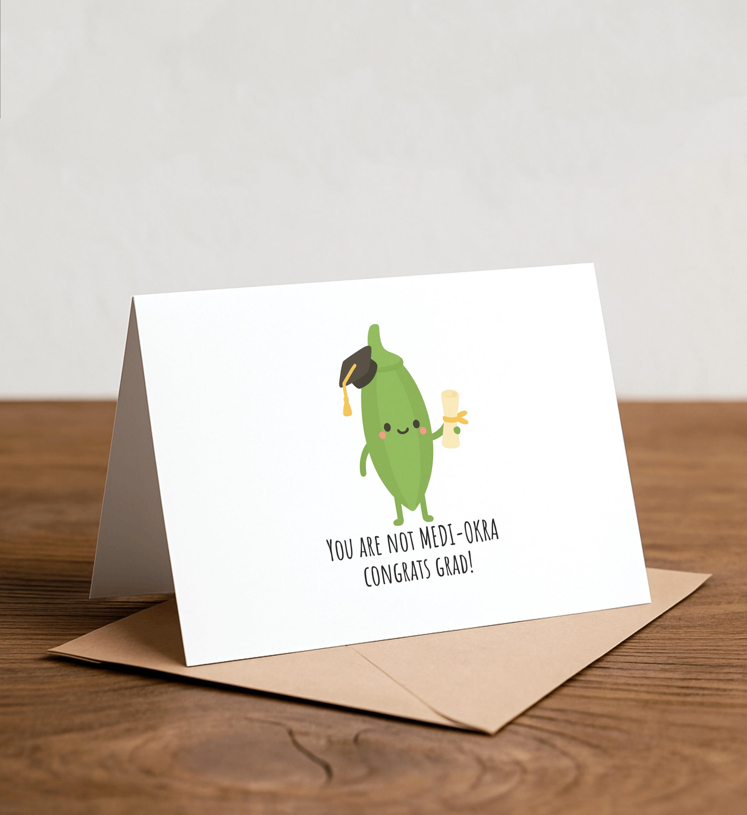 Funny Graduation Card, Medi-okra Pun, Congrats Grad!