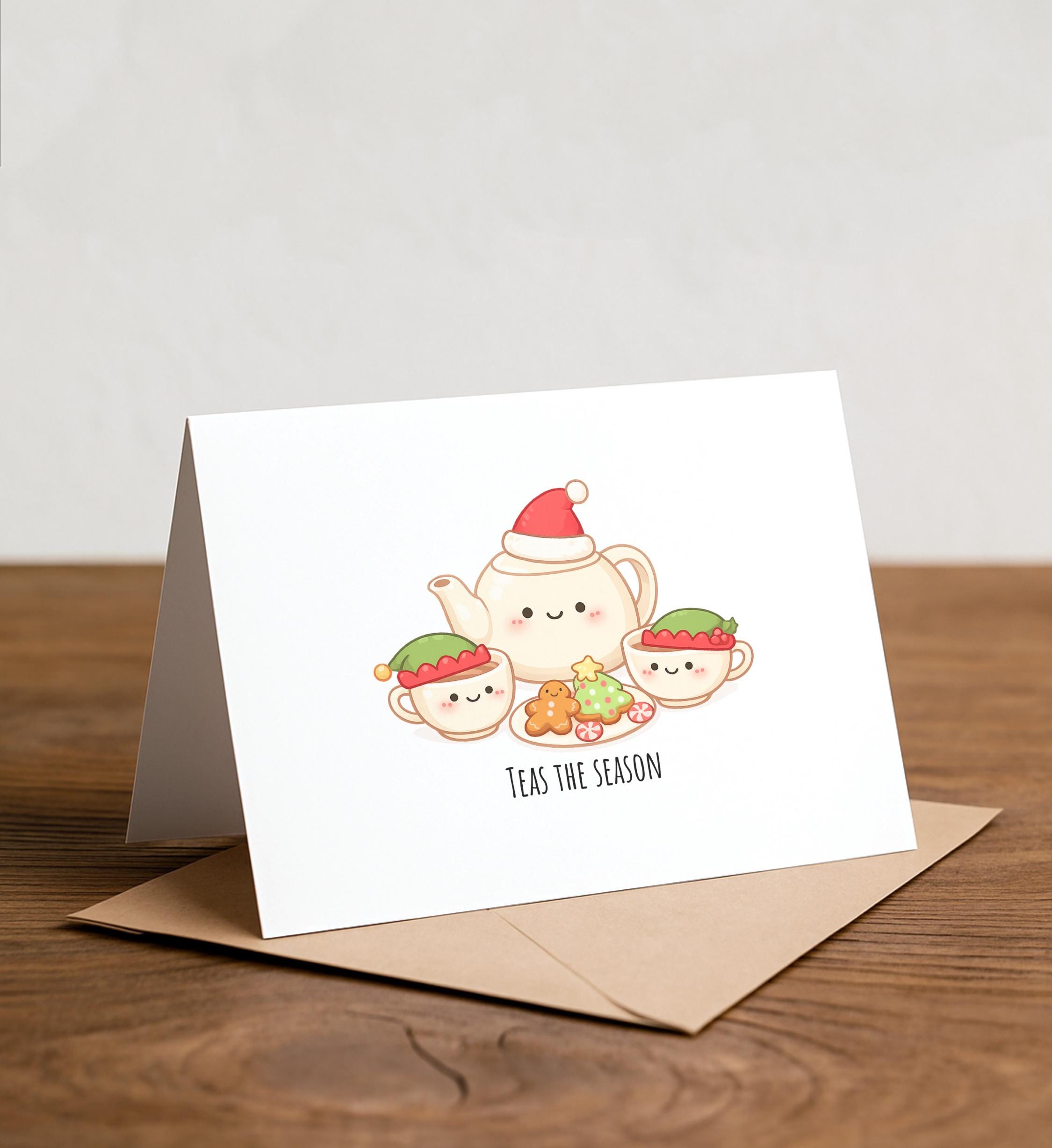Tea Holiday Card - Teas the season, teapot, holiday card, hot cocoa, hot chocolate, cozy, warm, winter card, cute winter