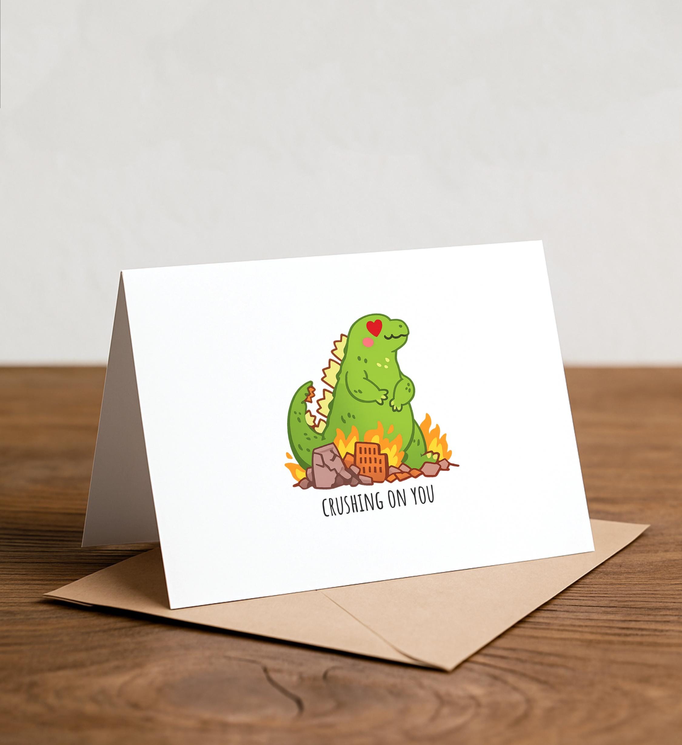 Godzilla Pun Greeting Card: crushing on you, valentine
