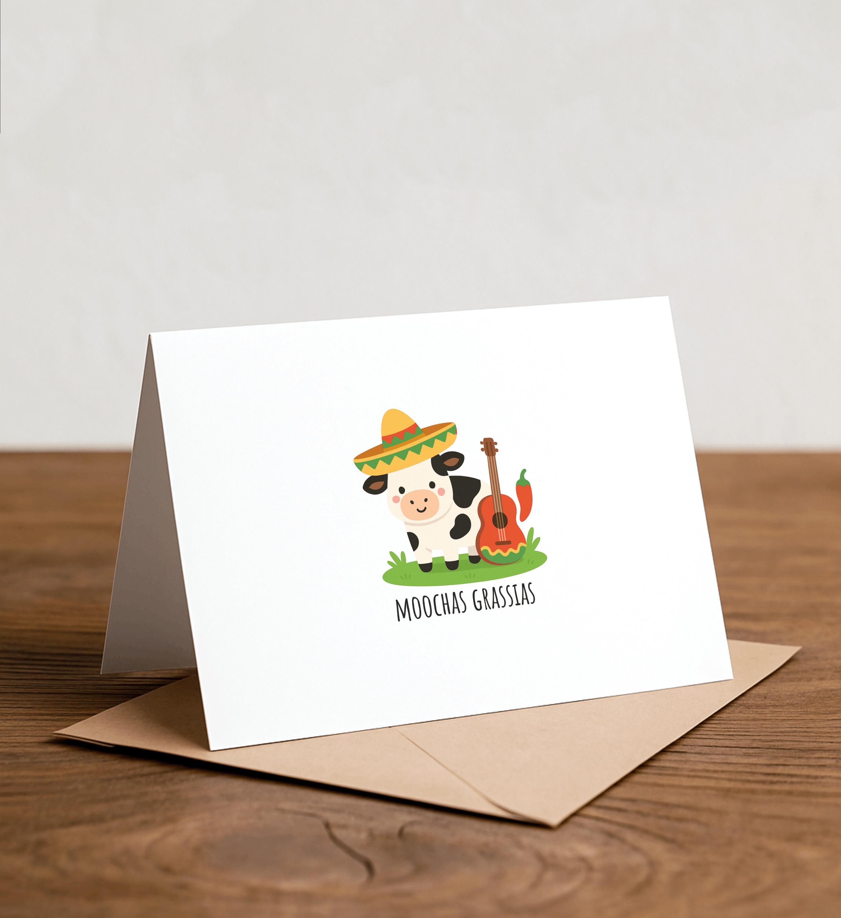 MOOchas Grass-ias - cute cow, Spanish, thank you, muchas gracias, Spanish pun, cow pun, thank you note, funny thank you