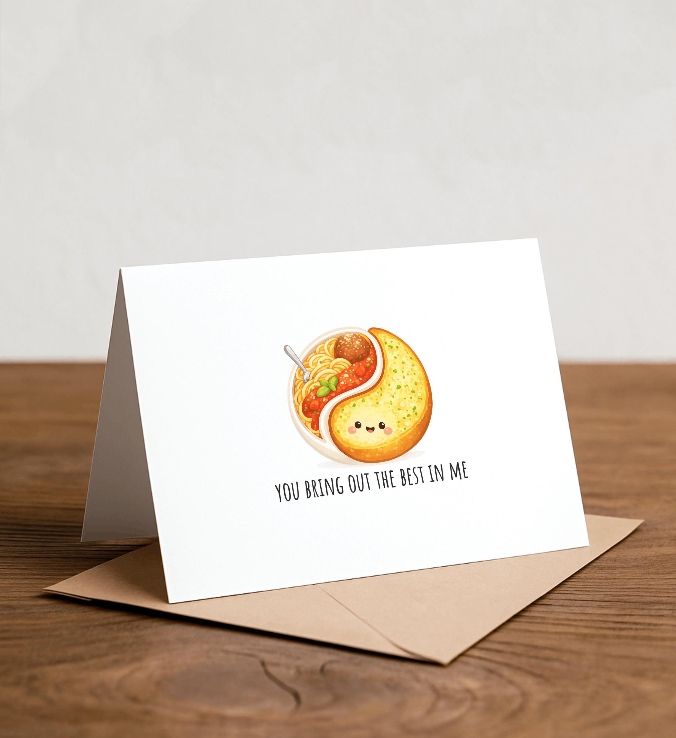 You bring out the best in me: Yin Yang Handmade Card, Valentines, Couples, pasta, garlic bread, italian food