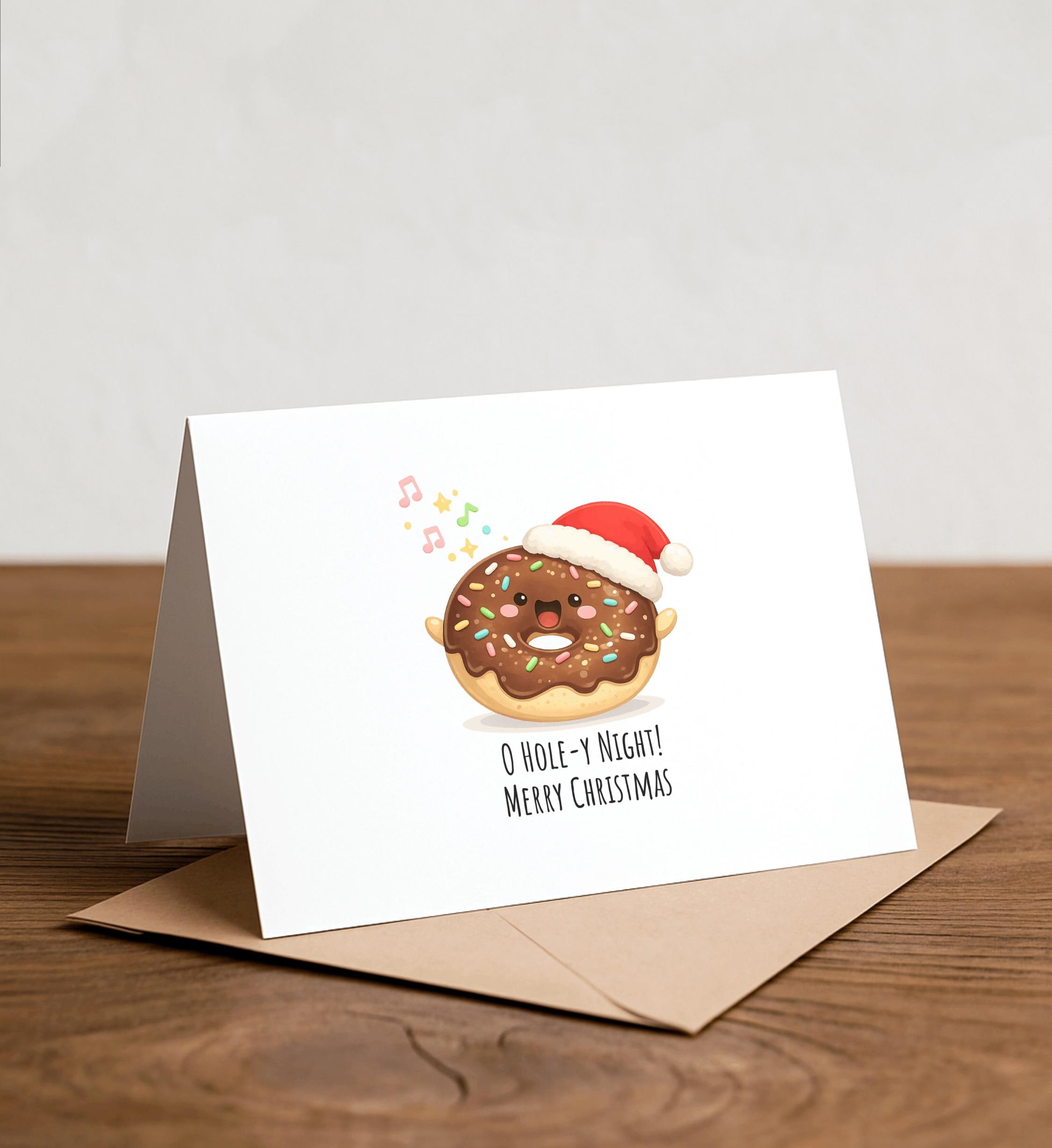 O HOLEY NIGHT - Donut Greeting Card, Pun Holiday Card, Donut Card, Punny Greeting Card, Holiday Card, Minimal, Chocolate Donut, Santa