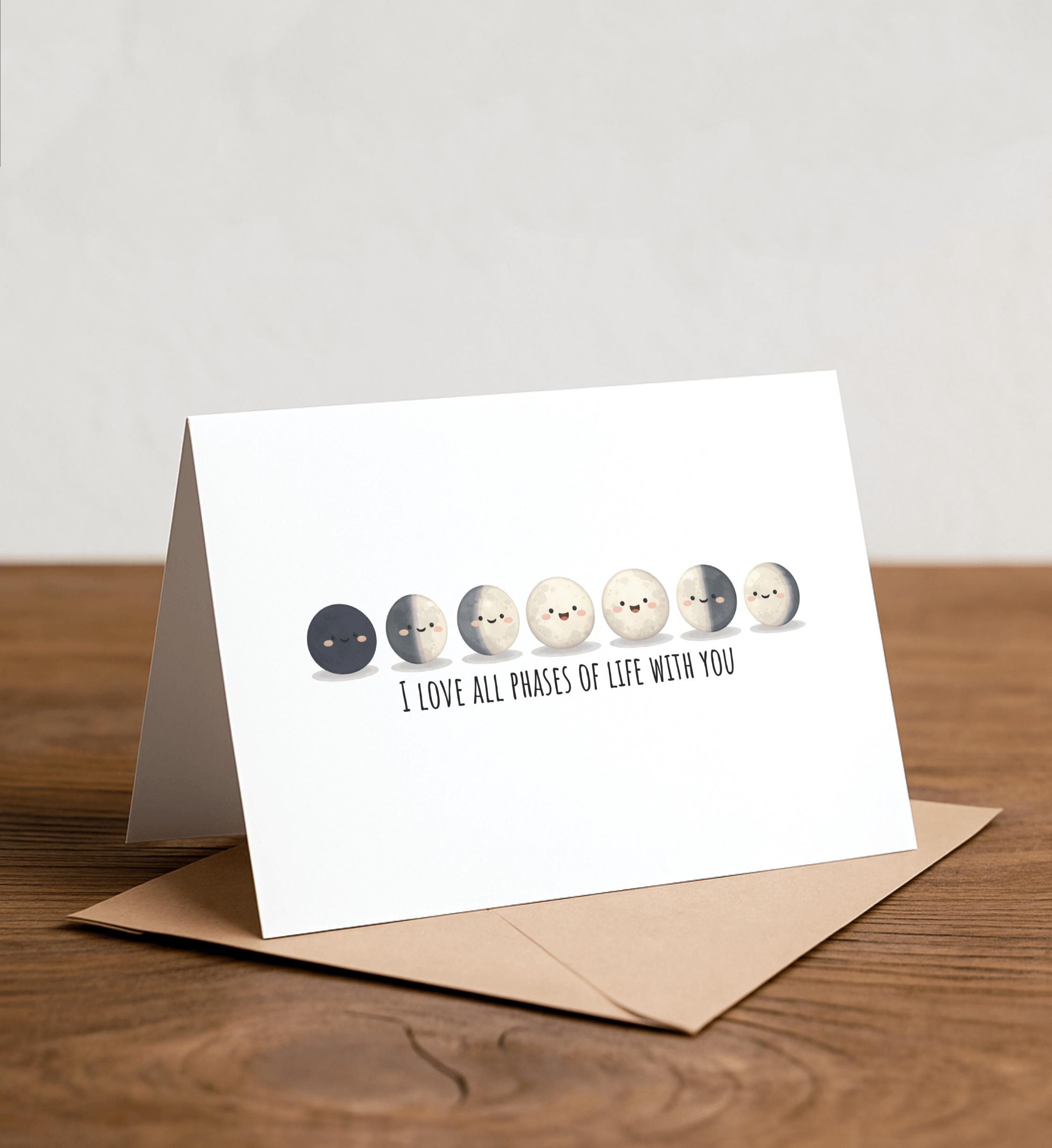 I love ALL phases of life with you - Moon Phases Greeting Card, Happy Card, Love Card, Full moon, lunar, crescent, Punny Greeting Card