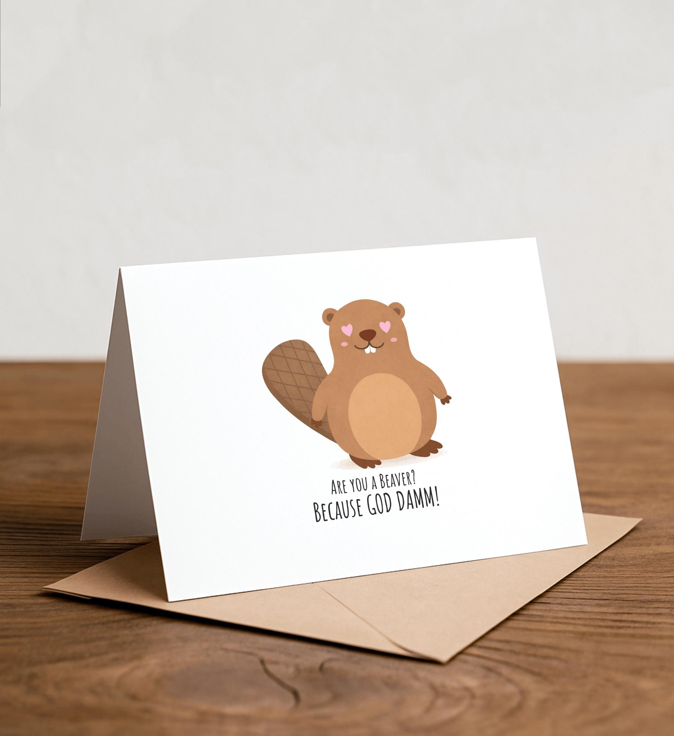 Are you a Beaver? because GOD DAMM - funny love card, funny valentine, beaver, animal pun, otter pun, beaver pun, Canadian card, Canada